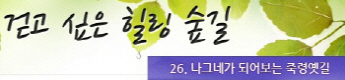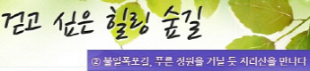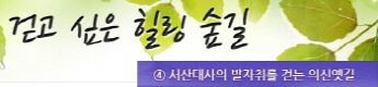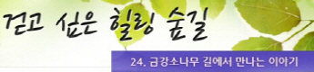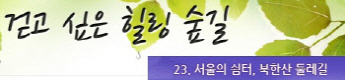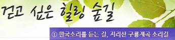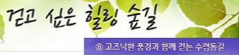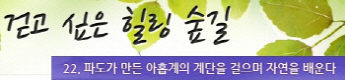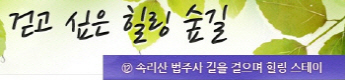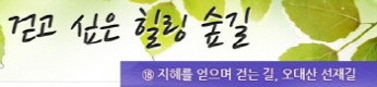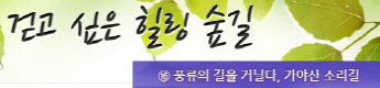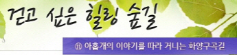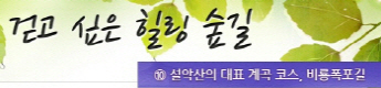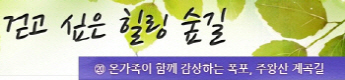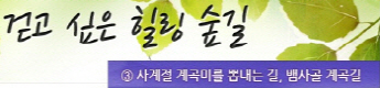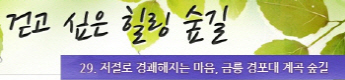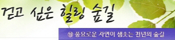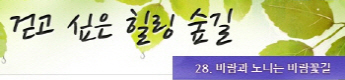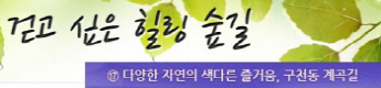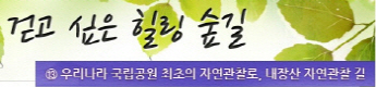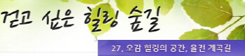 걷고 싶은 힐링숲길 서울디지털대학교에서 제공합니다 구룡계곡 소리길 불일 폭포길 뱀사골 계곡길 의신옛길 화엄 풍경길 갑사 오리숲길 미륵도 달아길 백담수렴 숲길 주전골 숲길 비룡폭포길 화양구곡길 법주사 숲길 자연관찰로 숲길 비자나무 숲길 삼나무 숲길 가야산 소리길 구천동 계곡길 선재숲길 전나무 숲길 주왕계곡길 달산포 숲길 정도리구계등 자연관찰로길 북한산 둘레길 금강 소나무 숲길 하늘재 숲길 죽령옛길 을전 계곡길 바람꽃길 금릉 경포대 계속 숲길 오감연결 숲길