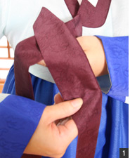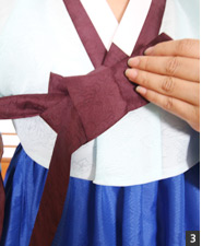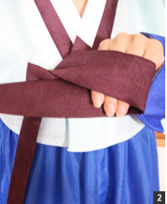 2. 왼손은 긴 고름을, 오른손은 짧은 고름을 각각 아래서 받치듯이 손으로 들어준다.