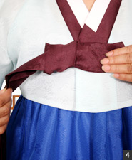 3. 오른손이 짧은 고름을 위로 가게 하여 X자 모양으로 교차시킨다.