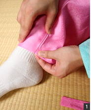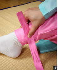 4. 부리에서 2cm 정도 올라간 곳에 대님을 두 번 돌려 안쪽 복사뼈 있는 위치에서 외코로 매어준다. 단, 리본으로 매지 않는다.