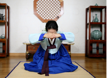3. 윗몸을 45°쯤 앞으로 굽힌 다음 잠시 머물러 있다가 윗몸을 일으킨다. 머리를 깊이 숙이지 못하는 이유는 머리 장식 때문이다.