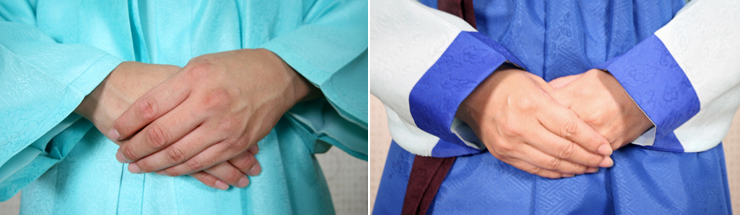 평상시 공수(拱手)는 남자의 경우 왼손이 위로, 여자의 경우 오른손이 위로 가게 한다.