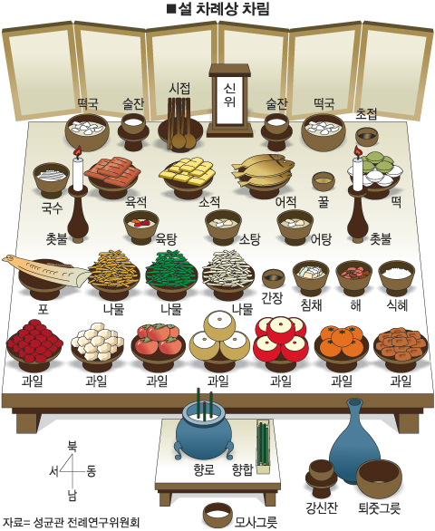 (12) 헌작, 유식(獻爵, 侑食) : 제주가 주전자를 들어 윗대 고위의 잔부터 아랫대 비위의 잔까지 차례로 다르고 주부는 윗대 고위부터 아랫대 비위까지 차례로 숟가락을 떡국에 꽂고 젓가락을 골라 시접에 걸쳐 놓는다.